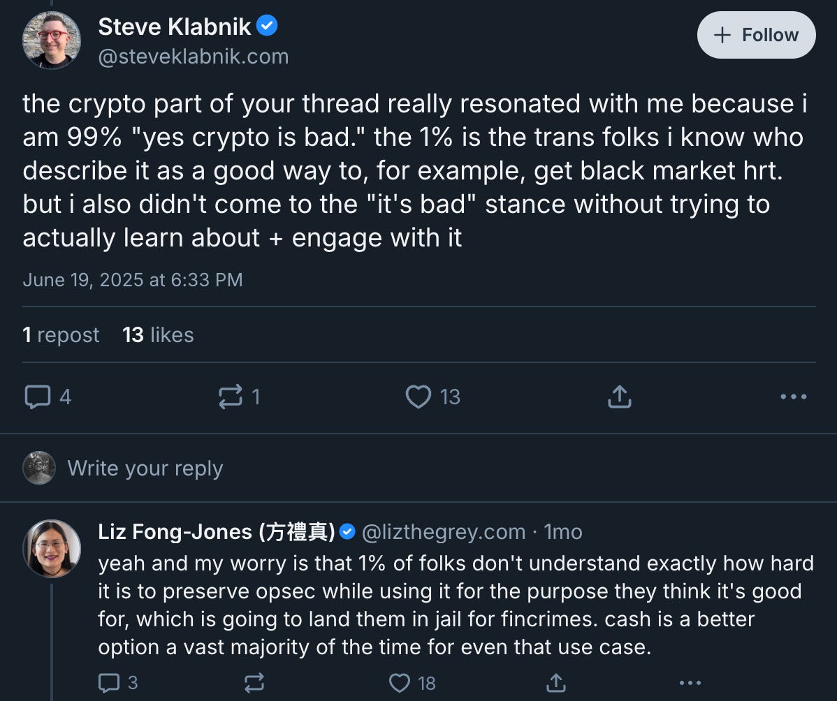 Even if your opinion of crypto is “it’s all bad”, also consider the value of using it to bypass life-saving medicine to the trans community? It’s never clear when a community will become the next target of censorship, exclusion, and oppression.