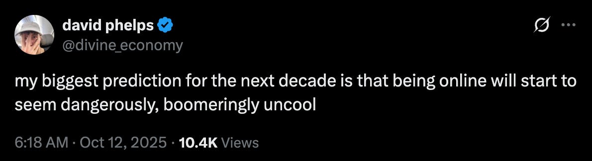 This kind of behaviour is not self-sustainable, especially when the digital spaces often turn against the individual (like changing features, moving to new platforms, governments potentially shutting it down, changing the algorithm, etc). It’s easier to keep and maintain an offline relationship versus a digital-only one. Digital will retreat to being a destination again, not *everything*.