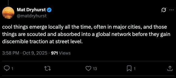 has a really interesting article on what’s perceived as the “crisis of cool” especially as it pertains to New York City’s position as a driver of culture (and coolness). Notably, it’s pointed out that the performance takes precedence over the art.A defining characteristic of 2020s New York culture is that the performance of being an artist has taken precedence over the production of art. The ingenuity of contemporary artists, their capacity for imagination, mystery, and style, is channeled into the creation of appearances, vibes, and happenings, of suggested bohemian worlds, rather than the fabrication of free-standing works of visual, literary, or musical art.