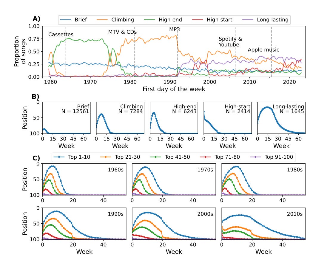 In this excellent study, you can also see that as time went on, the Billboard 100 became less egalitarian. Top songs linger, but the bottom quarter of it rotates much faster than the 60s.