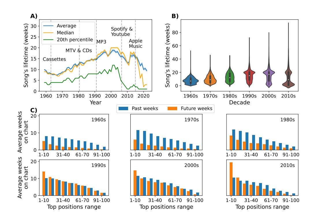 Two competing and seemingly contradicting theories concerning the skewness of the music market have emerged in the literature in recent years. These theories can be referred to as the “winner-takes-all” theory and the “long-tail” theory. The supporters of the winner-takes-all theory say that some superstars can capture a significant portion of the market with just a few songs. On the contrary, the long-tail effect states that more and more audiences switch to less popular artists, decreasing the concentration around the most famous performers. Interestingly, in our work, there is evidence that both effects are present in modern music. Our finding that songs debut at better positions and have longer chart lives may be due to the winner-takes-all superstar phenomenon. Conversely, the “long-tail” effect can be spotted in the increased traffic in the chart’s bottom positions and shorter lifetimes for poor-performing songs.