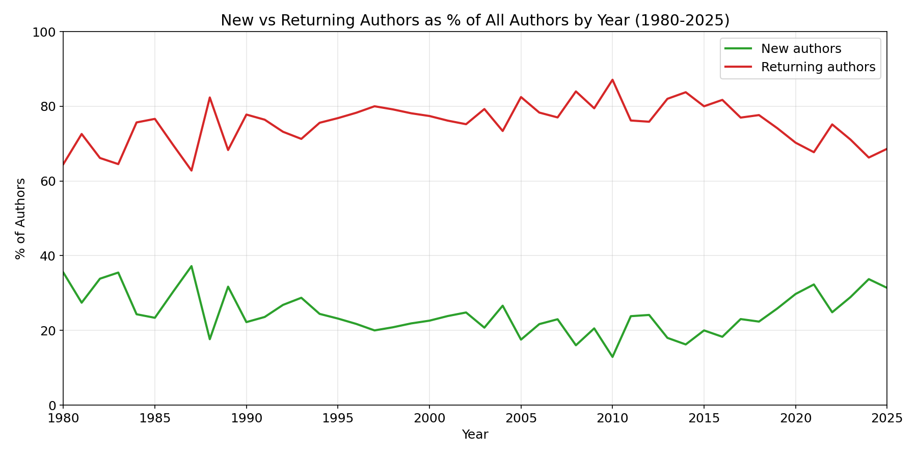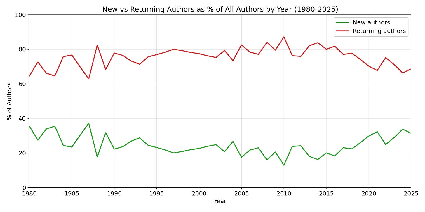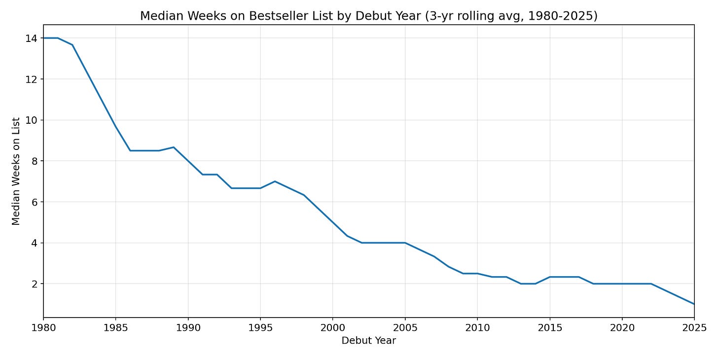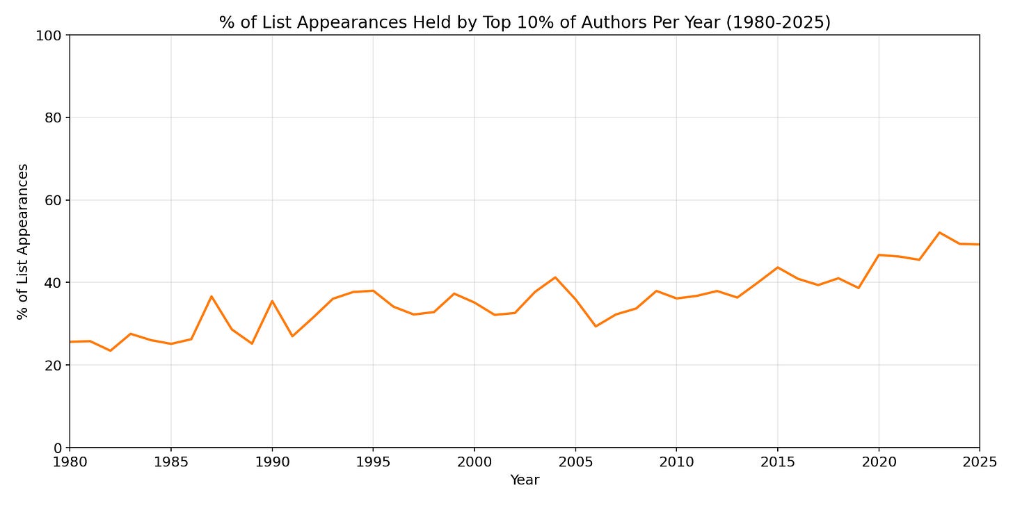 The fiction publishing industry is a bit more opaque in terms of sales and numbers, but I also looked at NYT Bestseller Lists (which is still partly editorialized to this day). Notably, I had to stick to hardcover releases since since combined print + e-book only lists only came out from ~2011. This means that the data should be far less consolidated because it only covers physical print releases, usually, in the launch period of fiction (from the music industry, physical album sales today are more egalitarian than streaming).