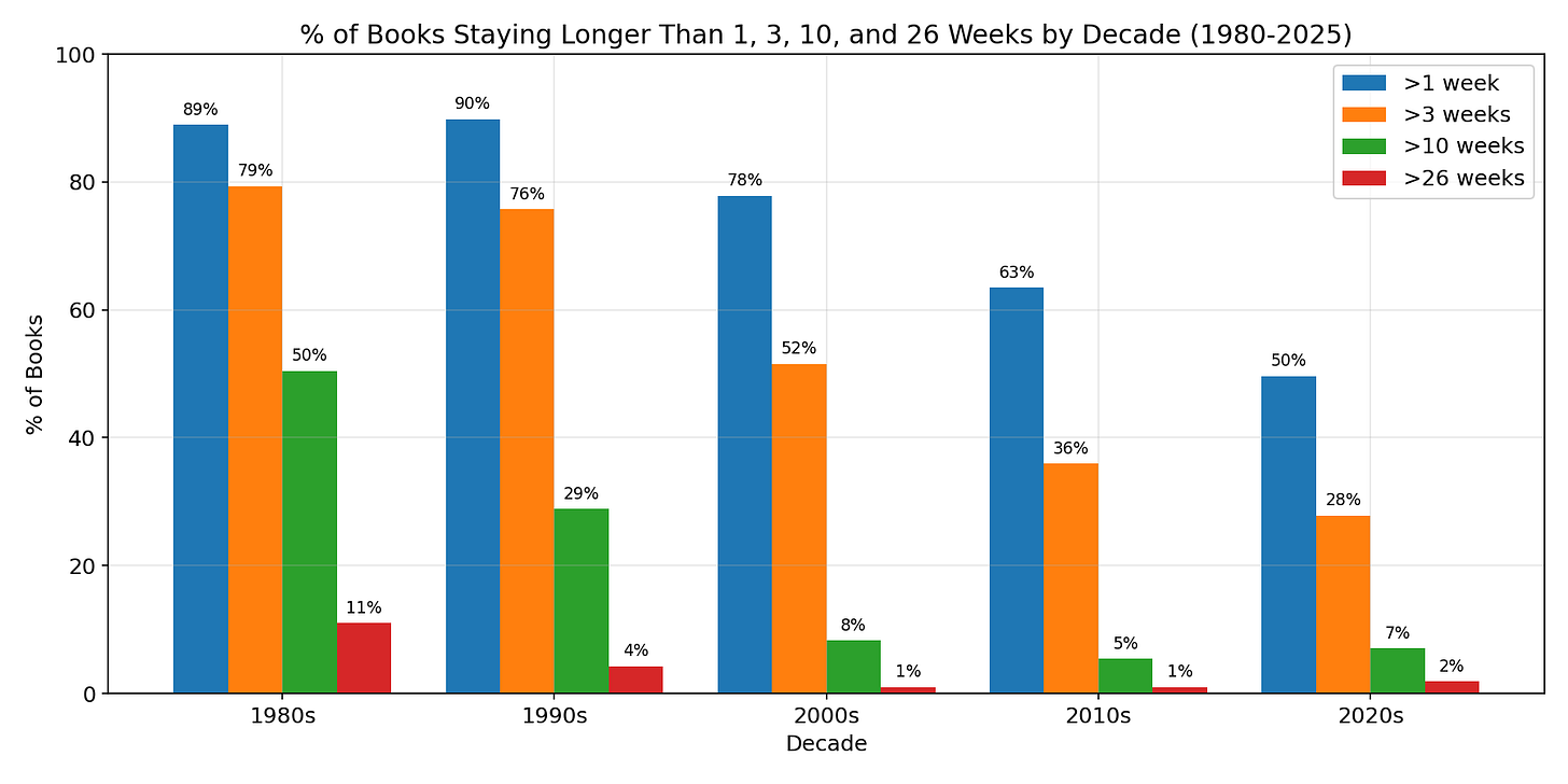Drilling deeper, however, in the 2020s, the majority of hardcover books only stay a week on the list, but the books with staying power (> 10 weeks on the list) have stayed roughly the same since the 2000s.