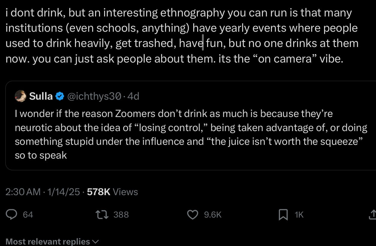 Too online and too many cameras. While binge drinking has declined (a good thing):