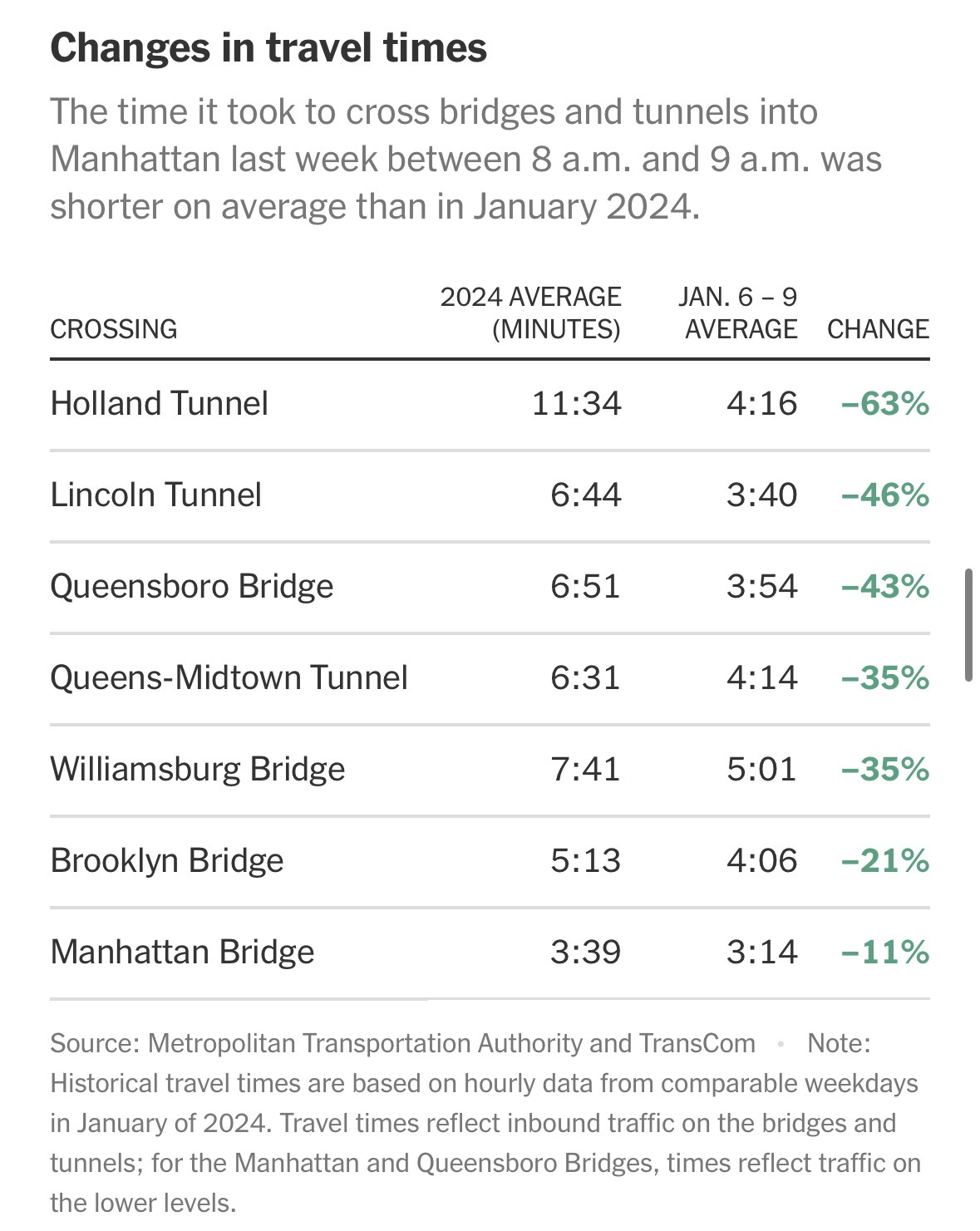 The launch of congestion pricing led to some 43,000 fewer drivers on average entering Manhattan below 60th Street each weekday last week than would be typical for that time of January, according to data released by the MTA on Monday. The data comes just over a week after the tolls went live.