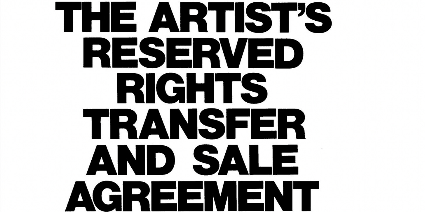 In 1971, conceptual artist Seth Siegelaub and lawyer Robert Projansky tried to realize that demand by creating The Artist’s Reserved Rights Transfer and Sale Agreement or “Artist’s Contract,” which sought to create contractual resale royalties. Several artists used the Contract to sell their work, including Hans Haacke and Adrian Piper, but it was always a fool’s errand because the contractual royalties it sought to create were largely unenforceable. Sure, artists can sue their collectors for reneging on royalties, but it’s usually unwise to bite the hand that feeds you.