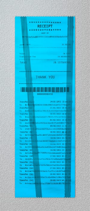 Speaking of crypto-social. I mentioned 0xHaiku’s Receipt a few issues back. It’s an NFT that dynamically pulls its provenance from the blockchain to create its image to look like a receipt. People have been sending it along among each other, filling out the receipt and the log over time. A simple, great experiment showcasing the value of social NFTs, but also the fact that NFTs bring their provenance along with them. It’s always there.
